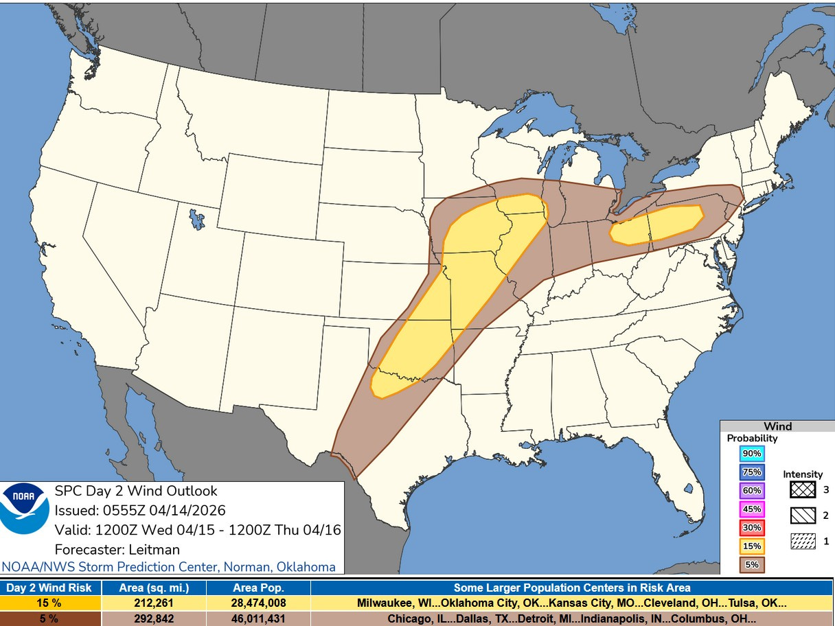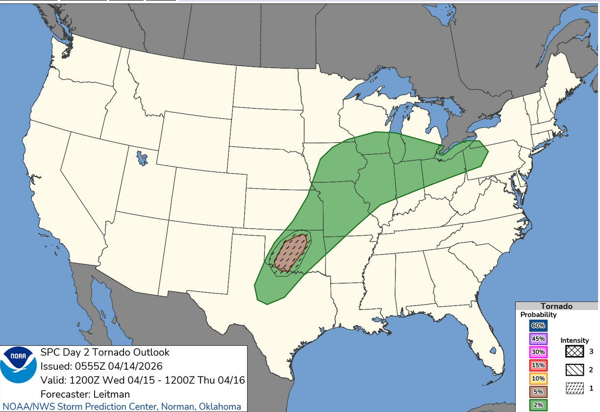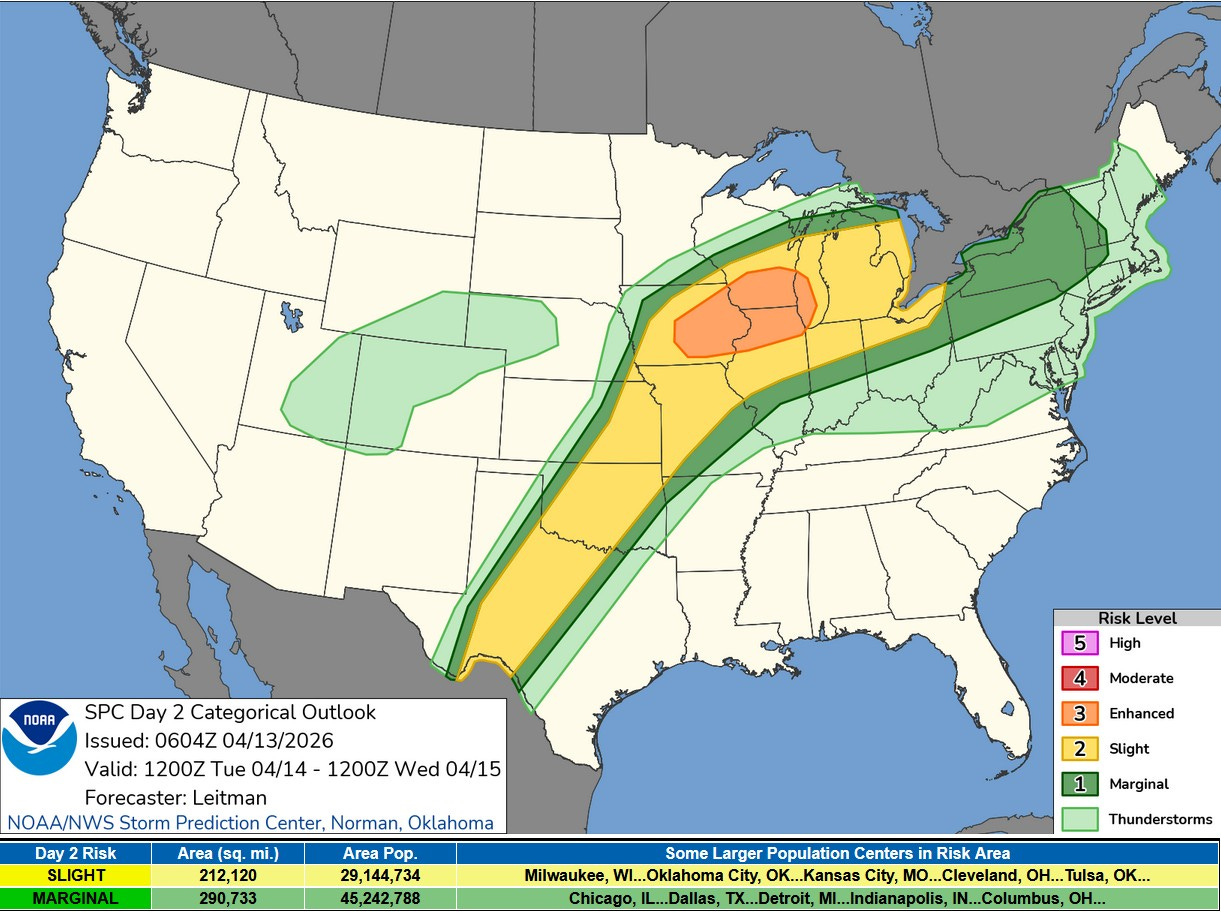 This is the Severe Weather Outlook Map from the Storm Prediction Center for this Tuesday. There is an Enhanced Outlook Area (level 3) across eastern Iowa, northern Illinois, southern Wisconsin and western Lake Michigan. That’s surrounded by a Slight Risk Area (level 2) that runs from Mexico to Ontario...and that’s surrounded by a Marginal Risk Area that runs south to Indianapolis and north to the Mackinac Bridge.