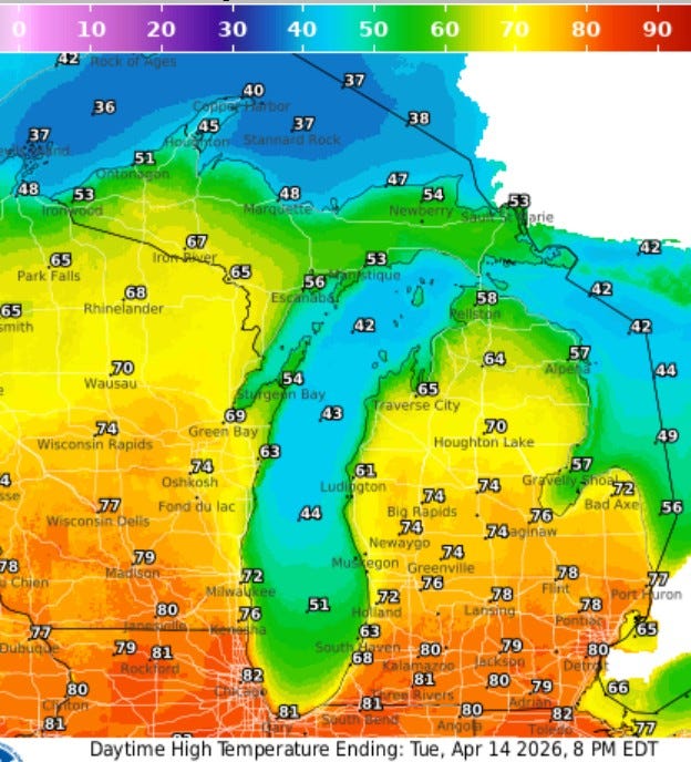 Here’s forecast high temperatures for this PM. We’ll see readings range from the low 80s south of Grand Rapids and inland from the lake to the 60s near Lake Michigan to just 40 degrees up at Copper Harbor in Upper Michigan. The average high temperature for mid-April is 57.