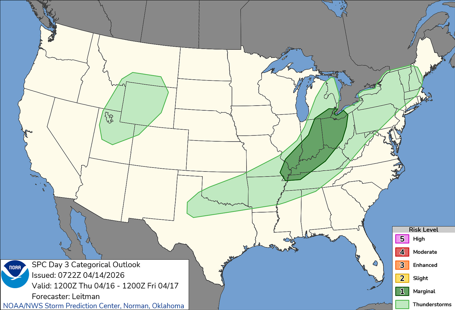 The Severe Weather Outlook Map for Thursday/Thursday night has just a level 1 Marginal Risk from the Missouri Bootheel to the Detroit area. Threats include an isolated strong wind gust, marginally severe hail and local flooding.