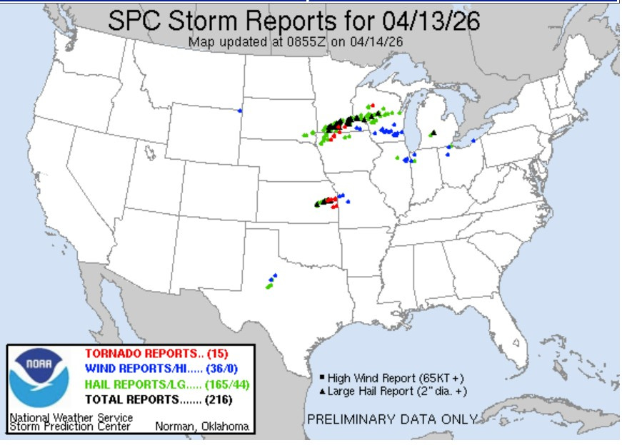 Here’s storm reports for Monday, 4/13 as of 5 am. The number is likely to go up a bit yet. There were 15 reported tornadoes - most relatively small and short-lived - 36 reports of wind damage and 165 reports of severe hail, with 44 reports of hail bigger than golf balls. Here in Michigan, we had 2” diameter hail at Portland in Ionia Co. and 1.25” diameter hail at Hastings in Barry Co.