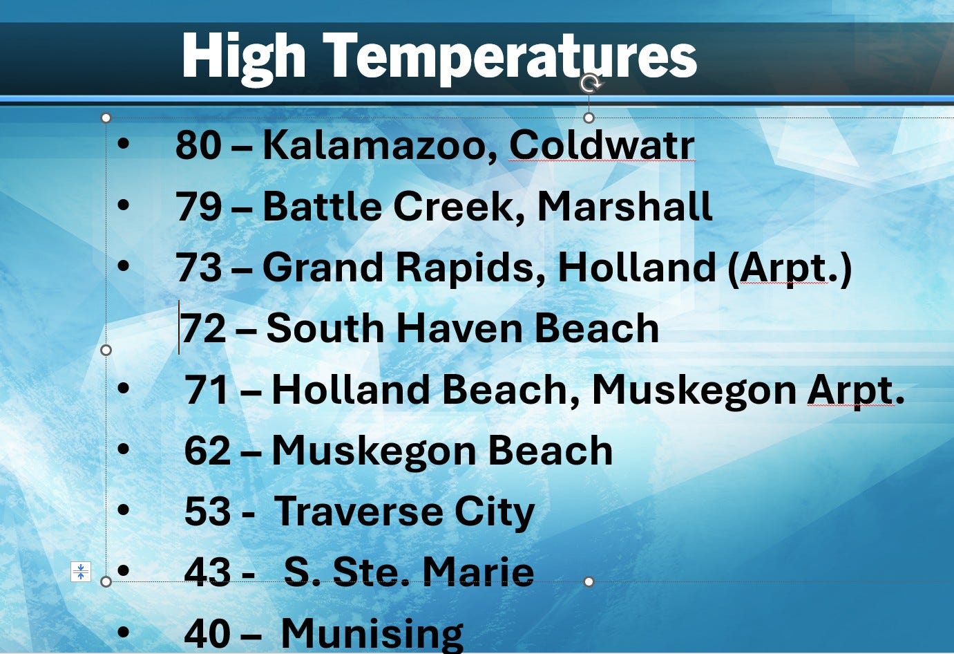 Here’s high temperatures from Monday. Again, a 40-degree spread from the Indiana border counties to the Keweenaw Peninsula. It was in the 70’s at Cadillac, but only low 50s at Traverse City.