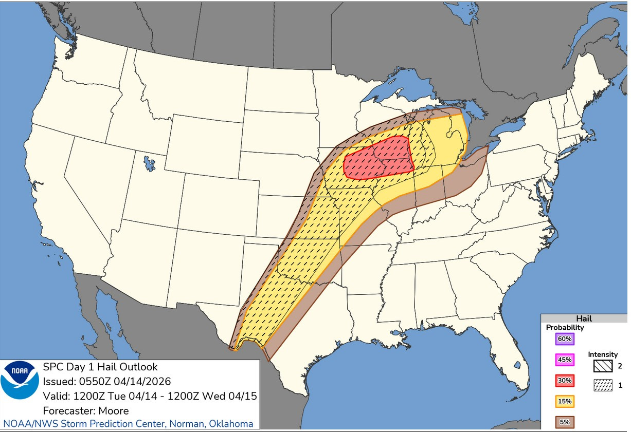 SPC says: “Severe thunderstorms are expected this afternoon through tonight from the southern Plains to the Great Lakes. Large to very large hail, a few tornadoes (some strong), and damaging wind gusts will be possible, particularly across parts of eastern Iowa, northern Illinois, and southern Wisconsin. Additional severe storms, mainly producing strong wind gusts will be possible.”