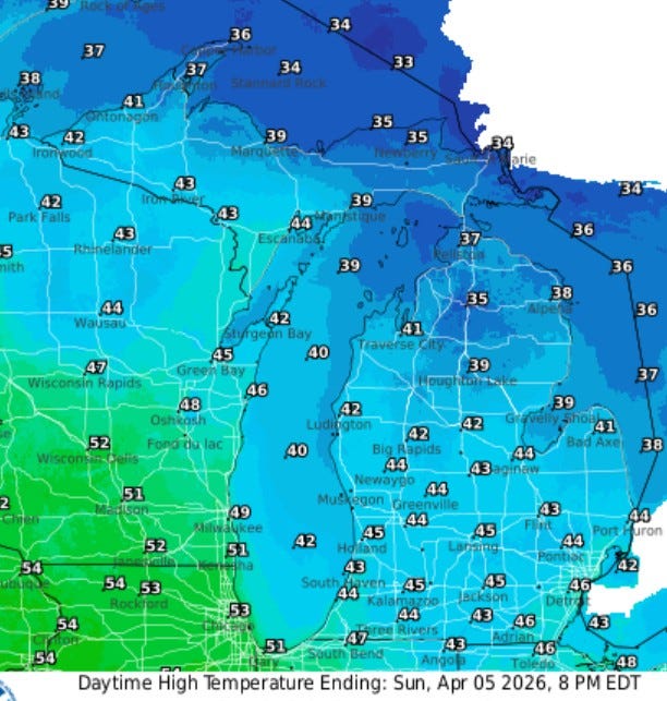 The average high temperature for today in Grand Rapids is 53. We’ll be on the cool side of average early this week, with highs in the low-mid 40s for Sunday, Monday and Tuesday. We could see a passing snow shower today (Easter Sunday), but just trace amounts to a dusting at most. Winds will be brisk, from the west at 15-20 mph.