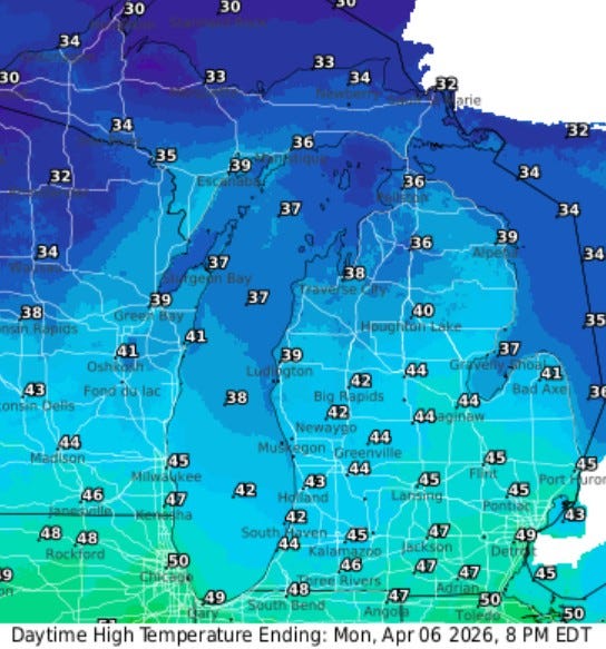 Here’s high temperatures for Monday…again, low-mid 40s. It’ll hold in the 30s across northern Lower Michigan and Upper Michigan.