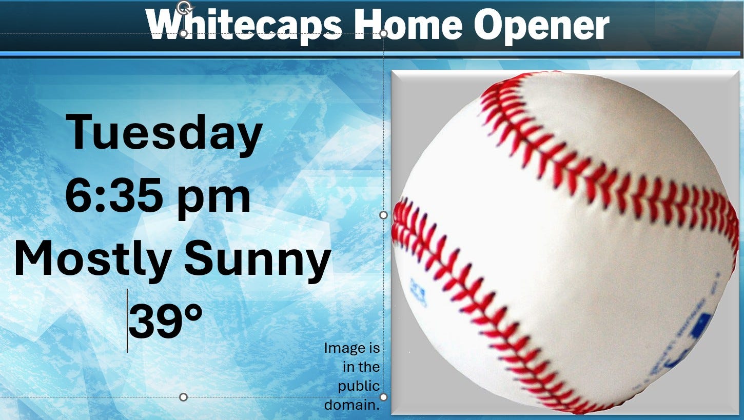 The weather will be fair, not foul for the Whitecaps opener Tuesday evening (April 7). We’ll see partly to mostly sunny skies. It will be cool - with game-time temperatures falling from the upper 30s to the mid 30s. I think they have fireworks after the game