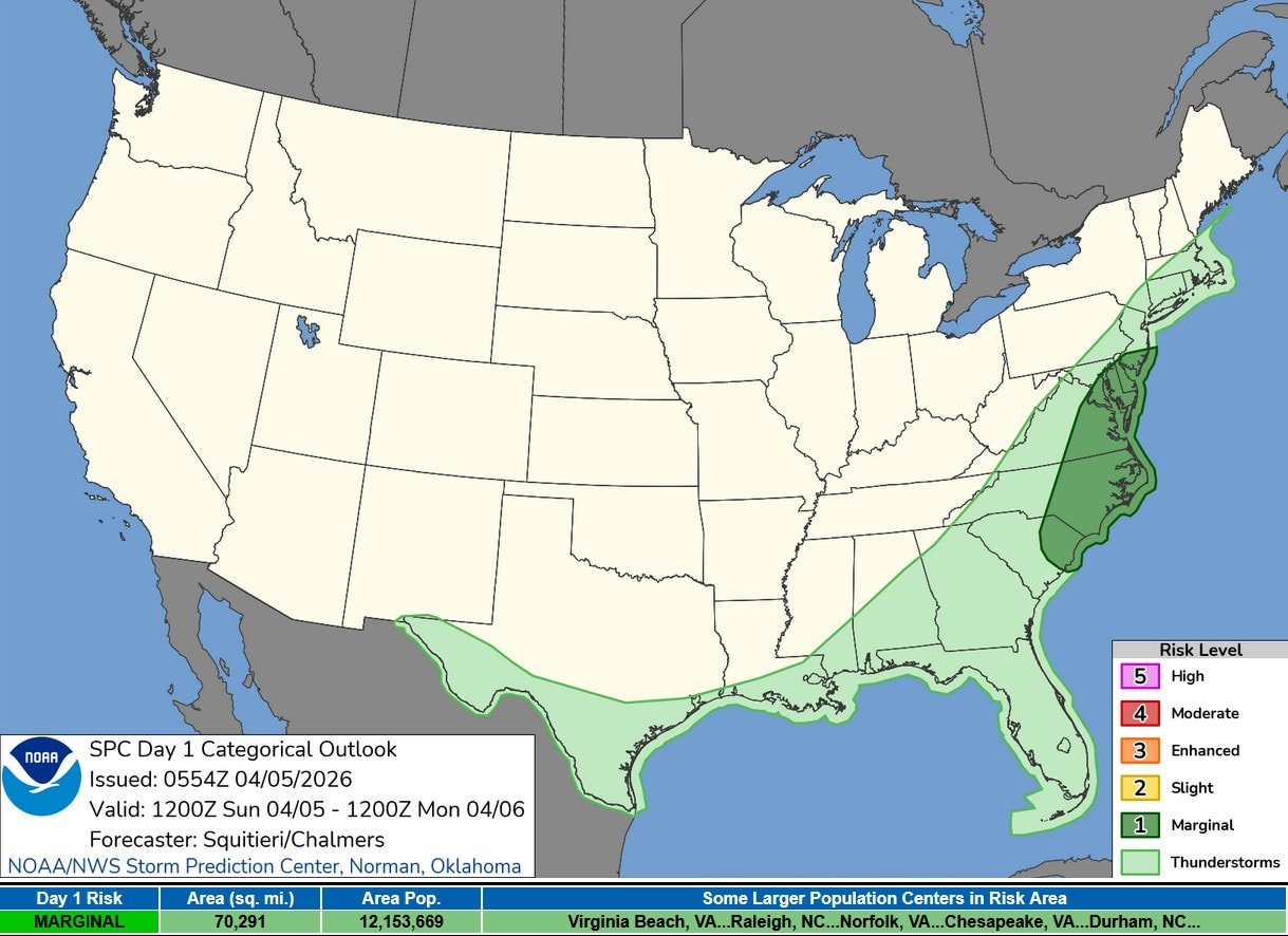 This is the Severe Weather Outlook Area for this Easter Sunday. There is a Marginal Risk from southern New Jersey to S. Carolina, mainly only for isolated strong wind report. The light green is a General Thunderstorm Outlook (not severe). There should be very little severe weather in the U.S. during the first half of this week.