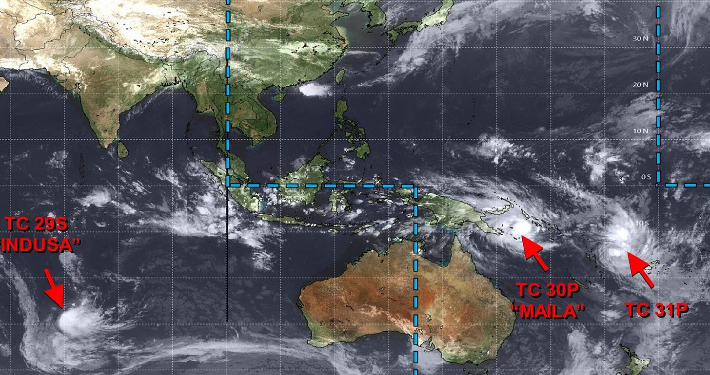 Tropical Cyclone “Indusa” will drift north and weaken far from land. Tropical Cyclone “Maila” is well east of Papua New Guinea and is moving northwest. Tropical Cyclone 31P is moving northwest. It will strengthen to around 100 mph, then weaken. It’s well west of Tonga and shouldn’t seriously affect any land areas.