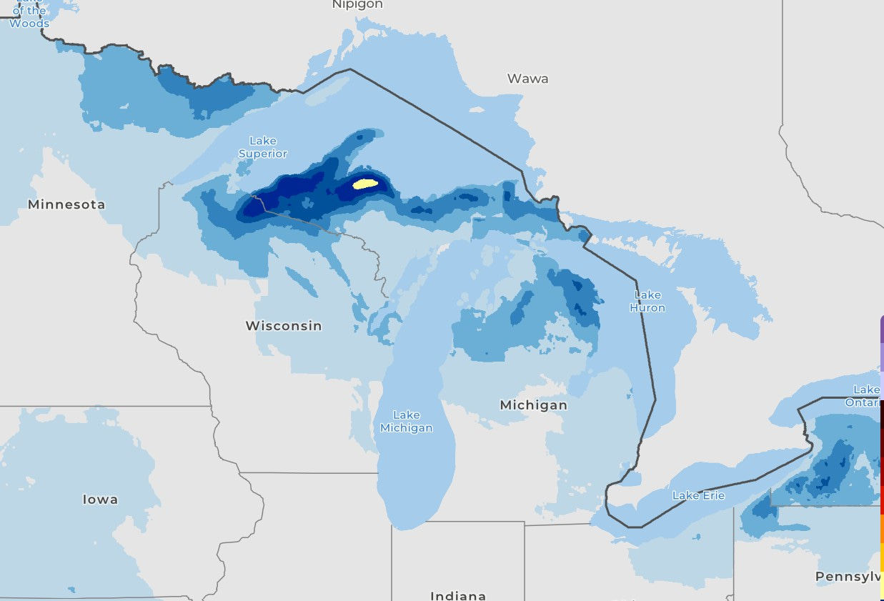 There’s another shot of snow coming for parts of Upper Michigan and northern Lower Michigan Sunday night and Monday. That yellow area west of Marquette is a forecast for 6” of new snow with much of the western U.P and Lake Superior shoreline in the 1-4” category. A couple inches will fall over a good portion of northern Lower Michigan with a few flakes east of Lansing and north of Big Rapids.