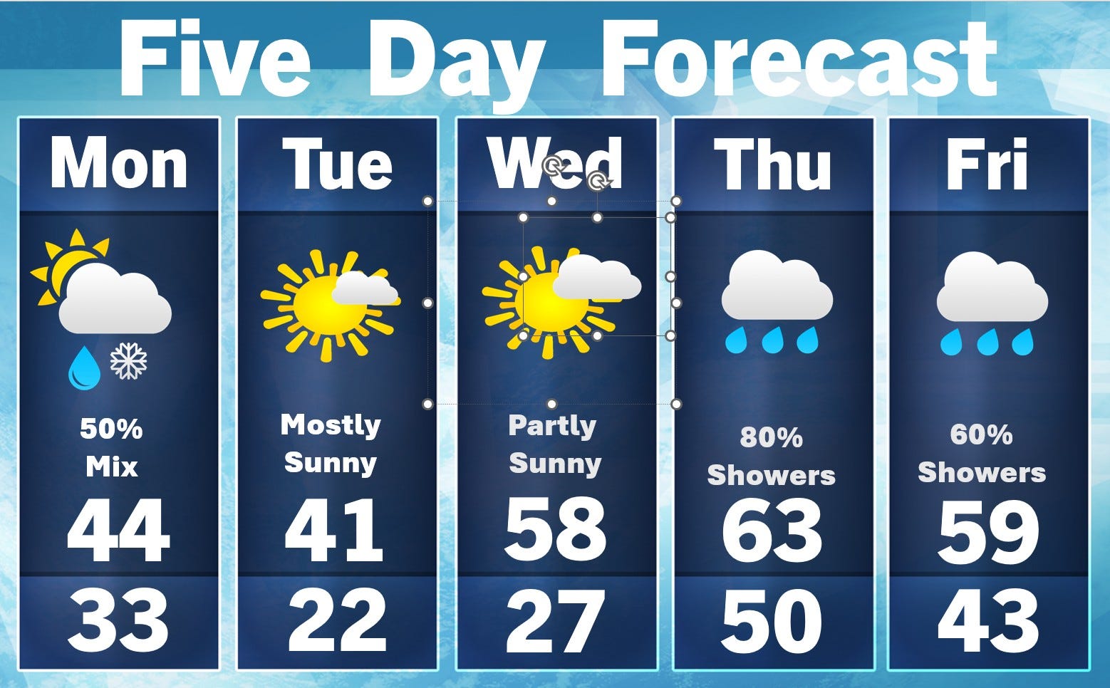 Here’s high temperatures for this Monday…the average high for April 6 is 54 and we’ll be around 10 cooler that today and tomorrow. We have about a 50/50 chance of a period of light to very light rain or snow today, but roads stay mostly clear.