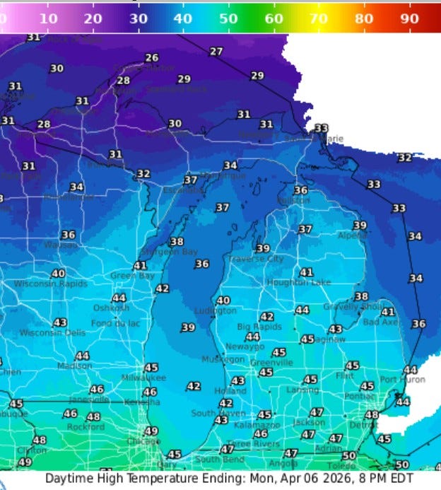 Here’s a record of Lake Michigan ice cover this winter. Here’s the percent of surface ice cover Sunday (4/5) on the Great Lakes: Superior 7.2%, Michigan 4.9%, Huron 15.2%, Erie 0.1%, Ontario 0%, Great Lakes combined 7.4%.