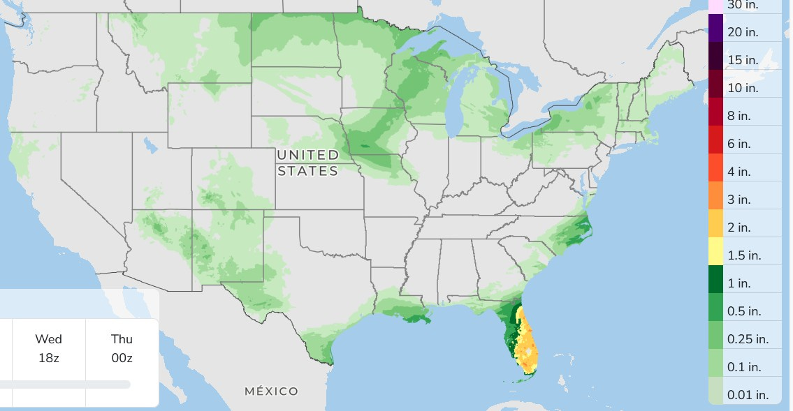 The heaviest rain in the U.S. over the next 3 days may be over the Florida Peninsula with some 1-2” totals. Anything in West Michigan today would be very light. There’s a better chance of some more significant rain on Thursday. Very little severe weather is expected in the U.S. over the next 3 days.
