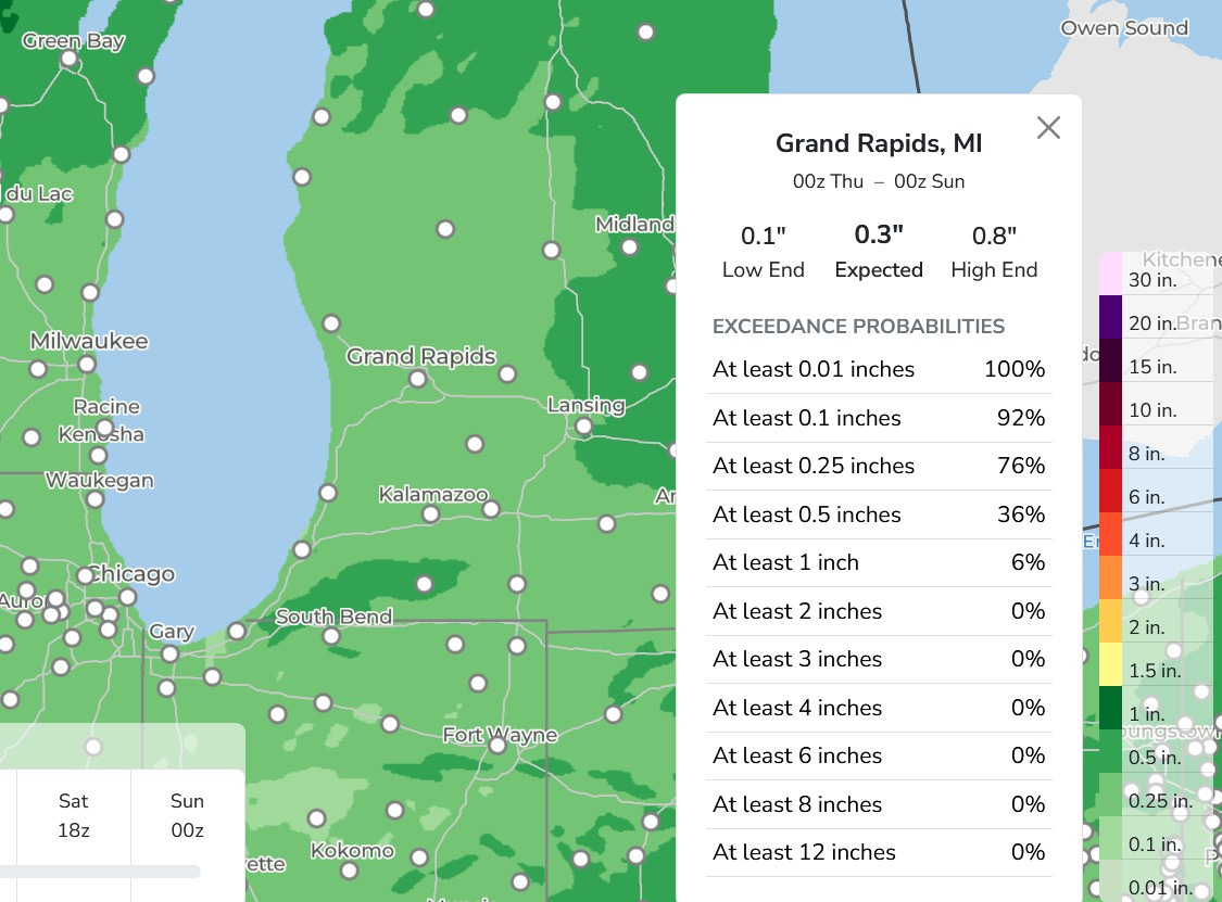 Here’s forecast rainfall for Grand Rapids Friday/Friday night. Expected is about 1/3rd inch…with a low end 0.1” (so the chance of rain would be high - 80-90%). We have a high end of around 3/4 inch. The rain looks pretty uniform…about the same amount across the whole area. This isn’t enough rain to cause a 2nd crest on mid-size and larger rivers.