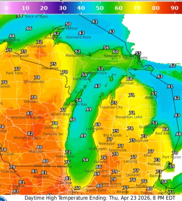Here’s high temperatures today in Michigan. After a little scattered early morning fog, the sun will be out for much of the day. Inland areas should make a run at 80°. It will be cooler right at Lake Michigan in the PM. This will likely be the warmest day we’ll have the rest of this month and maybe the warmest day we’ll see until the 2nd week of May.