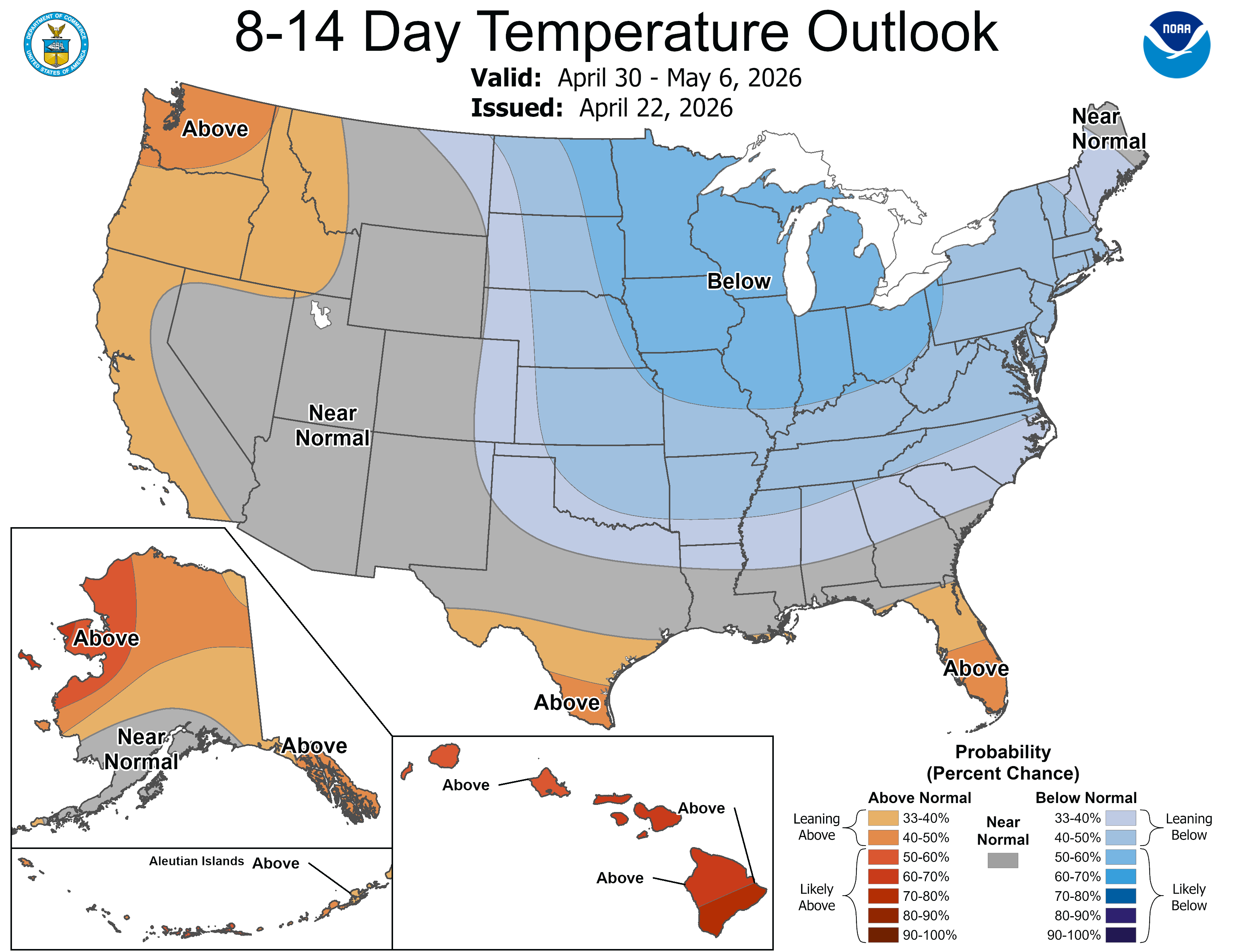 This is the 8-14 day temperature outlook from the Climate Prediction Center for April 30-May 6. Cooler than average temperatures are likely in the Great Lakes. It’s forecast to be warmer than average in the Florida Peninsula, South Texas and along the West Coast. With this pattern, we may not be done with frost in Lower Michigan. For much of West Michigan, the average last frost is in the first week of May.