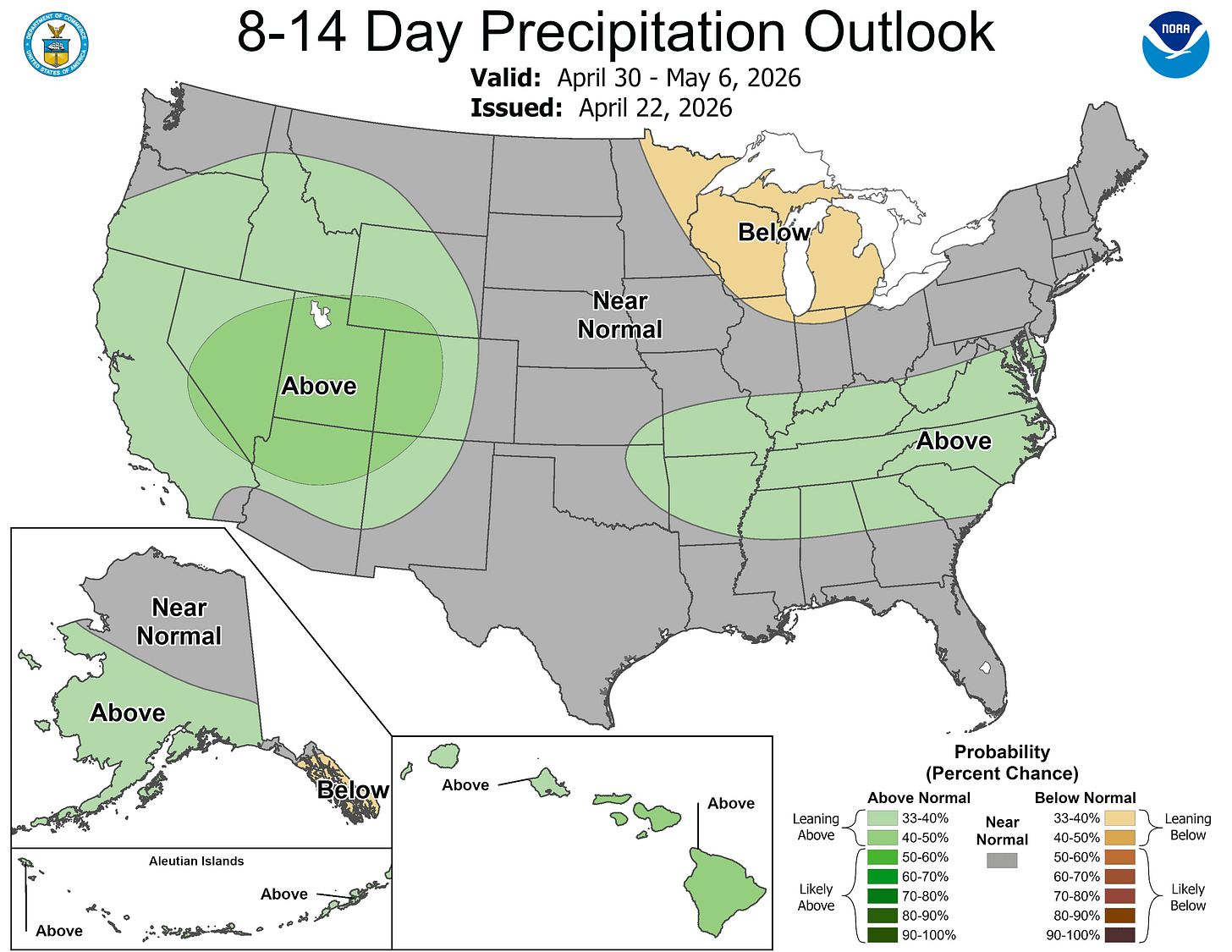 On the other side of the coin, Ketchikan AK, one of the wettest places in North America, has been dry for 3 of the last 4 days. Their April rainfall has only been 55% of average. They have now gone 16 days without a wind gust over 27 mph. Temperatures there have been pretty consistent. The warmest high temperature this month at Ketchikan has been 56° and the lowest high temperature has been 42°.