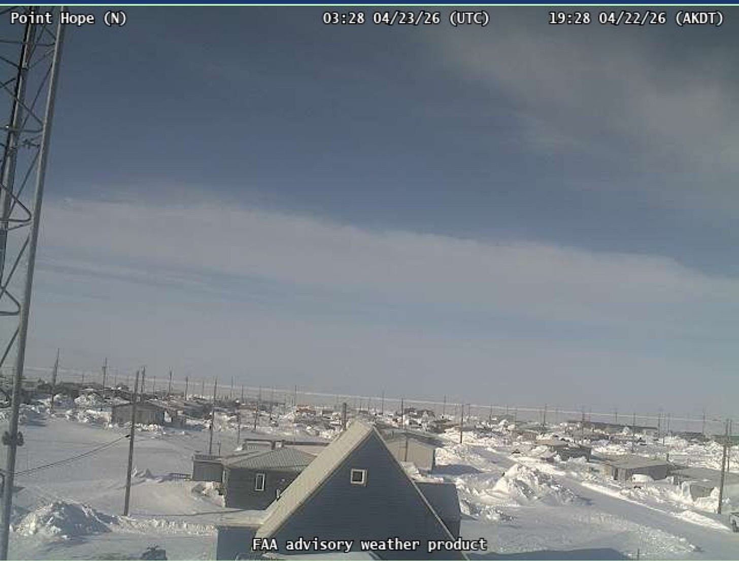 This is a screen grab from the webcam at Point Hope, Alaska. The sun is shining. Here, the days are getting longer at a fairly rapid clip. Today they get 8 1/2 minutes more daylight than yesterday. Today the sun rises at 6:35 am and doesn’t set until 11:37 pm. They are north of the Arctic Circle, so they get 24-hours of daylight during mid-summer. The sun will rise on May 24 at Point Hope and won’t set again until July 19th. You can see the winter snow has barely started to melt.