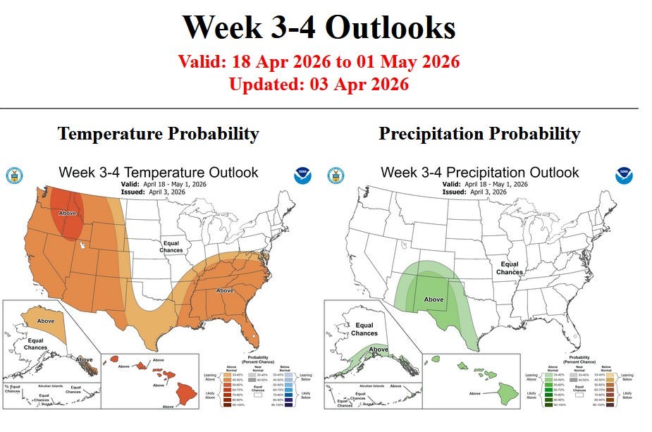 Here’s the 3-4 week forecast from the Climate Prediction Center. They have Michigan with an equal chance of above and below average temperatures and rainfall. I’d be inclined to continue the pattern of a little above average rainfall for the Ohio Valley up into S. Michigan. There is still a lot of cold air in Canada and the contrast between the warm, moist air from the Gulf and the cold air from Canada should result in an ample number of thunderstorms.
