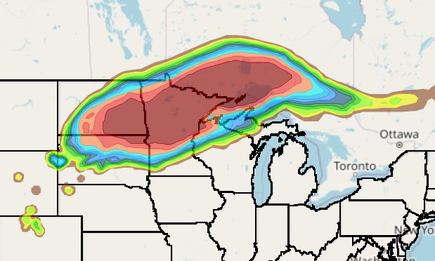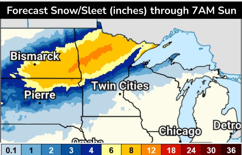 First, we’re missing an Easter snowstorm/icestorm. The map above shows where the shovelable snow will fall, with the heaviest snow from NorthDakota across Minnesota and up into Southwest Ontario. There will be some 8-12” totals there.