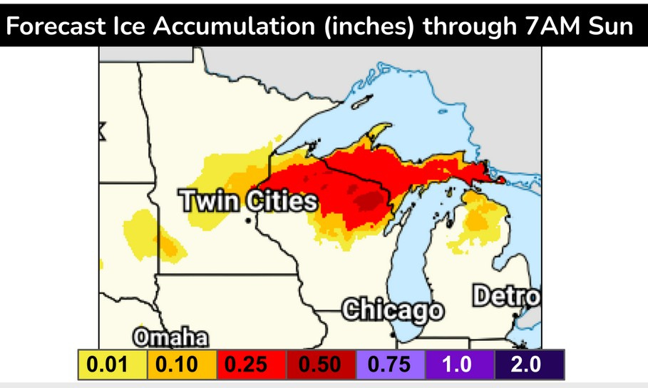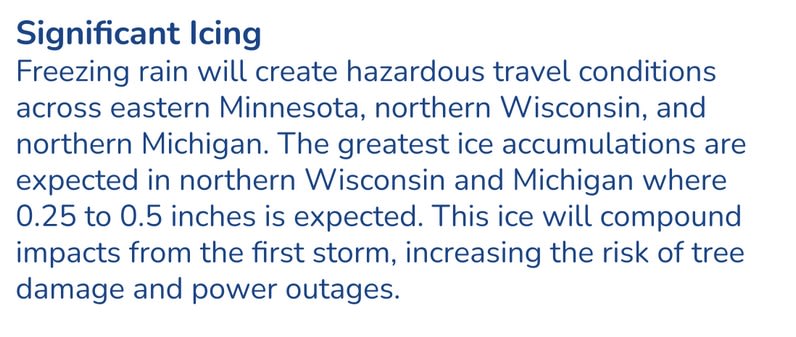 Here’s the forecast ice accumulation, centered on northern Wisconsin and Upper Michigan. There could be a period of freezing rain in northern Lower Michigan, north of Houghton Lake. WPC says: