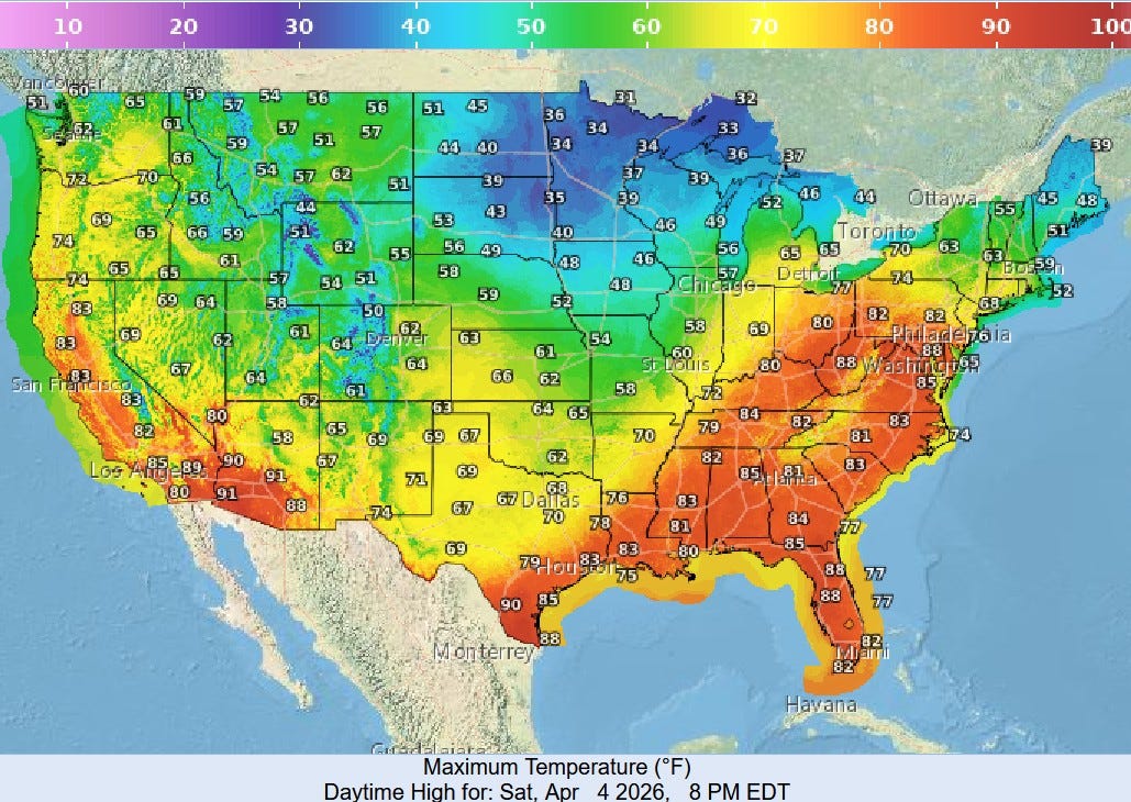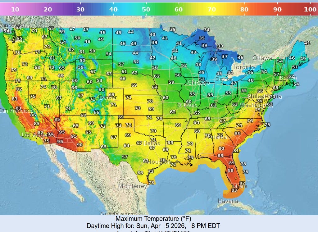 Here’s high temperatures for Easter Sunday. It’ll be another warm day in Florida and the Desert Southwest, with generally cool weather from North Dakota to Michigan.