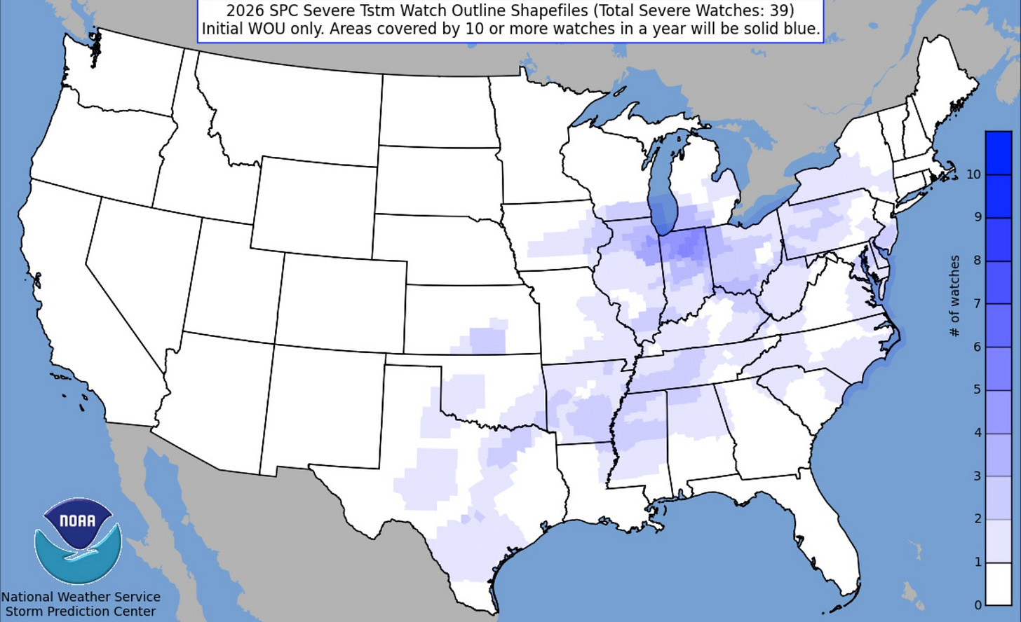 One final note - this is interesting…a plot of all the Severe Thunderstorm Watches (not Tornado Watches) in the U.S. so far in 2026. The greatest number of watches has been in Northern Indiana (darkest purple on the map), with a high concentration in northeast Illinois and southwest Michigan. Since the U.S. gets more tornadoes/severe storms than any other place on Earth…it looks like globally THE place to watch storms so far this year has been northern Indiana!