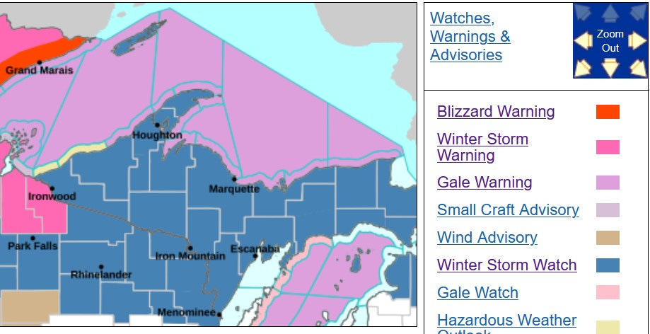 There’s a Winter Storm Watch in effect for all of Upper Michigan, plus Emmet and Cheboygan Counties of Lower Michigan for this (Thu.) evening through Friday afternoon. This first storm could produce 5-12” of snow, wind gusts to 45 mph, considerable blowing and drifting snow and treacherous travel conditions.