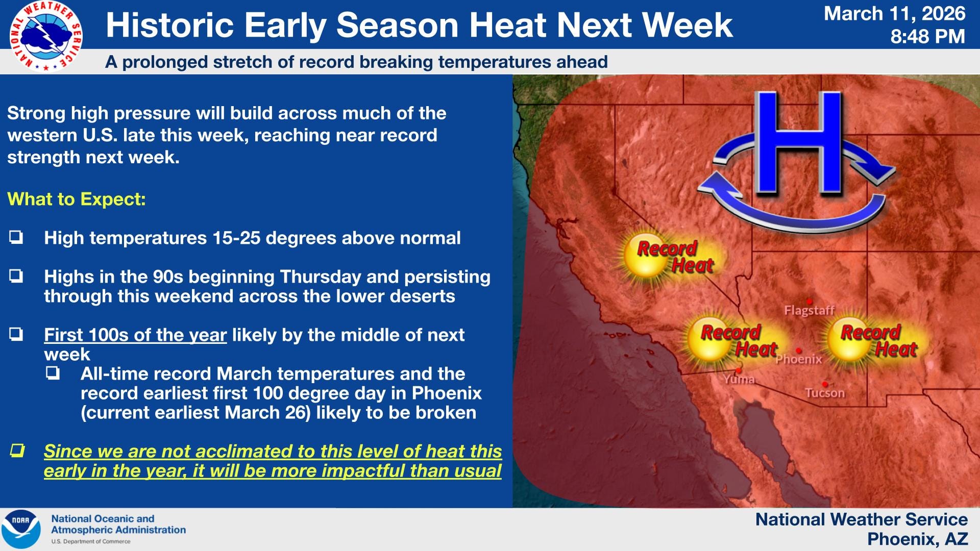 And…the heat is on in the Southwest. Temperatures will soar above 100 in the desert areas of southern Arizona and southeast California.