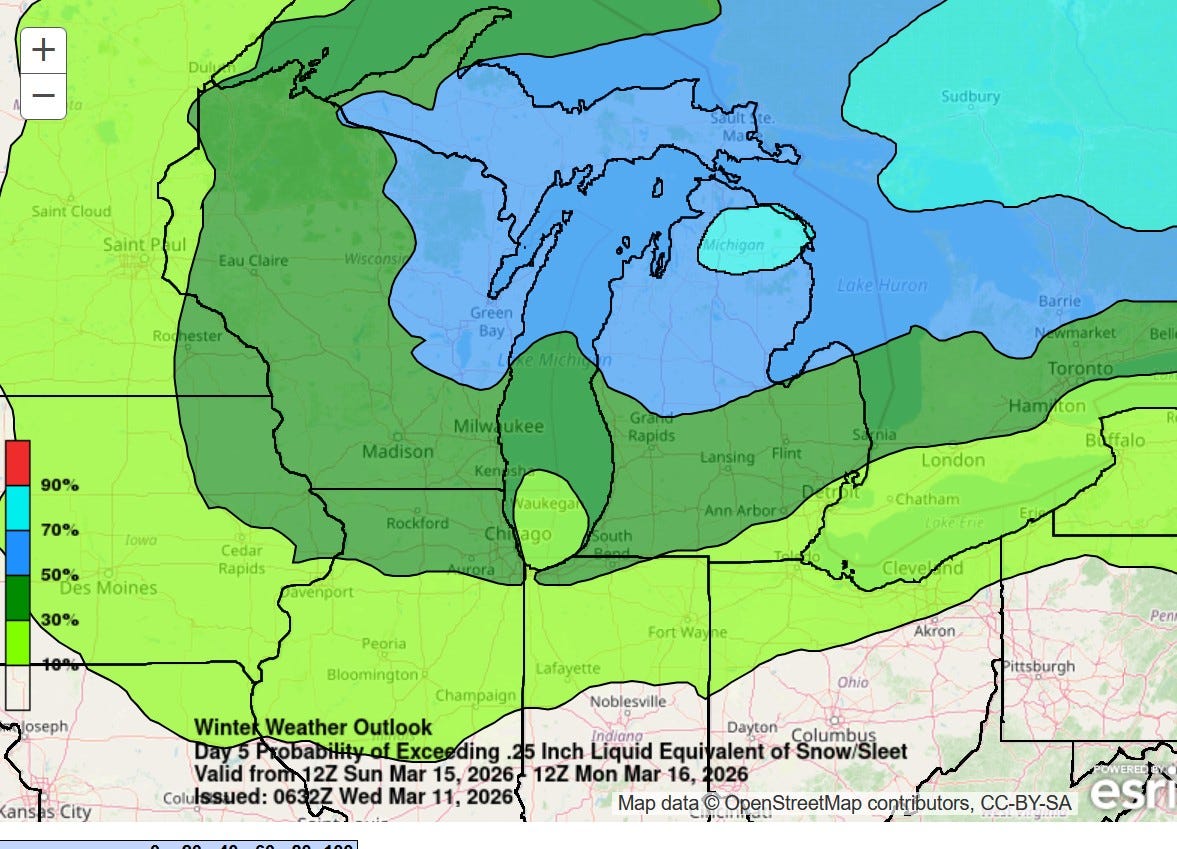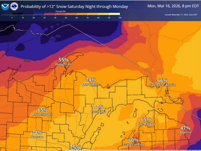 This map from WPC shows the Day 5 (Sunday/Sunday night) probability of 0.25” of precipitation…that would likely be 3-4” of snow…the 50% line comes down to around Montague to Rockford to Midland. There will be places in the U.P. that see 2 FEET of snow in the next several days.