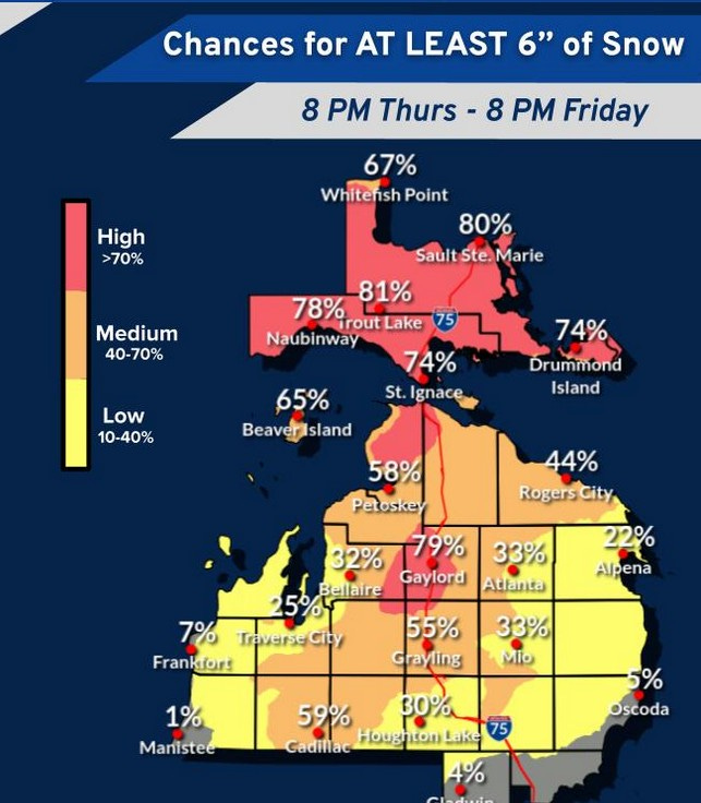 Here’s what the Friday storm could mean for N. Lower Michigan. This is the percent chance of 6” or more of snow from this storm…59% for Cadillac, 79% for Gaylord.