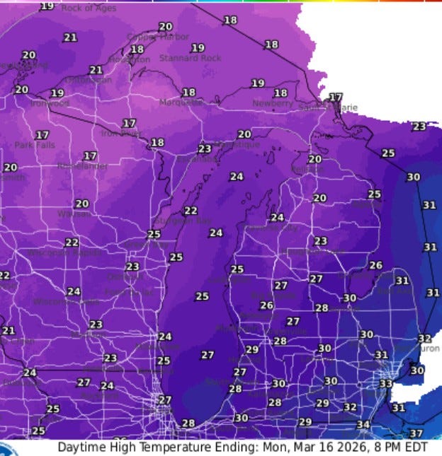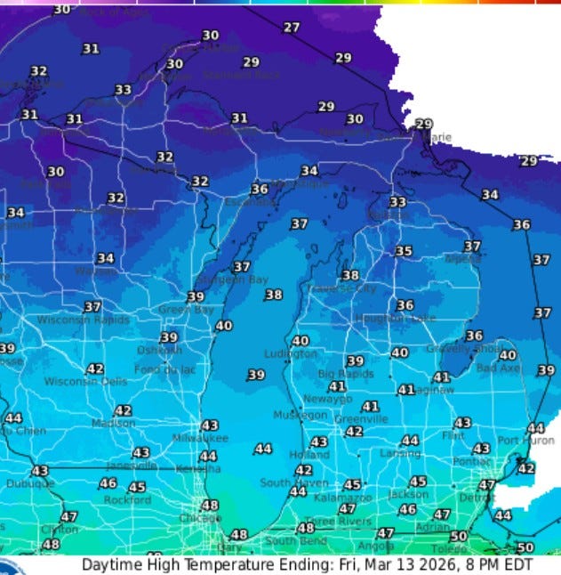So, there will be two big storms (low pressure centers) crossing the Great Lakes. These will be windy storms with steady winds of 20-35 mph on Friday with gusts to 50-60 mph possible (most likely area to see the strong gusts is the Lake Michigan shore). Monday will also be a windy day. As the Arctic air arrives, temperatures may only be in the mid-upper 20s on Monday and Tuesday (St. Patrick’s Day).