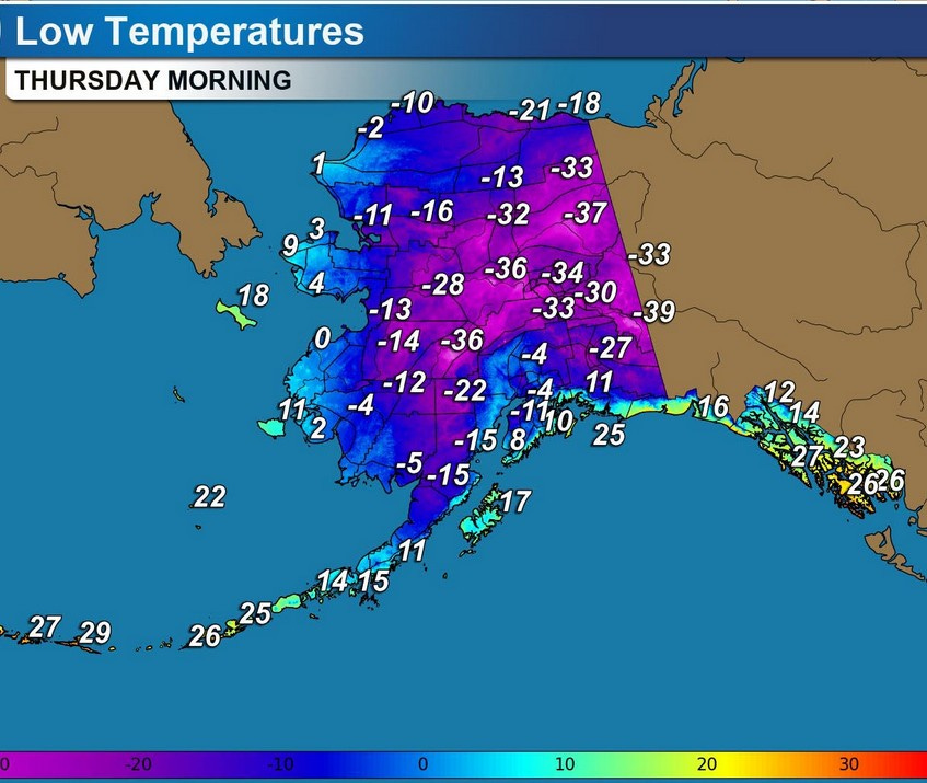 Here’s forecast low temperatures for Alaska for this Thu. AM. The -41 at Fairbanks Wednesday morning tied a record low temperature and was 34 degrees colder than average. Anchorage reach -2 and that was 19 degrees colder than average.