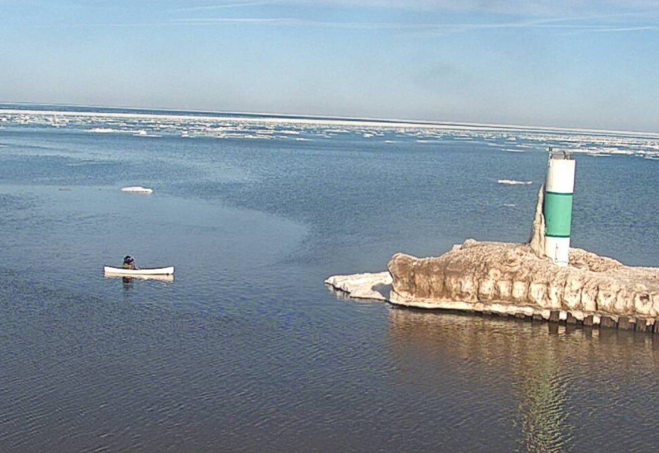 Here’s a pic. from the GLERL webcam atop the South Haven Lighthouse. You’re looking to the northwest across the channel and out into Lake Michigan. The pic. is from the afternoon of Thursday, Feb. 19. There aren’t any significant ripples by the canoe, so I guess this person was not going too fast. The water temperature was 32.2 degrees.