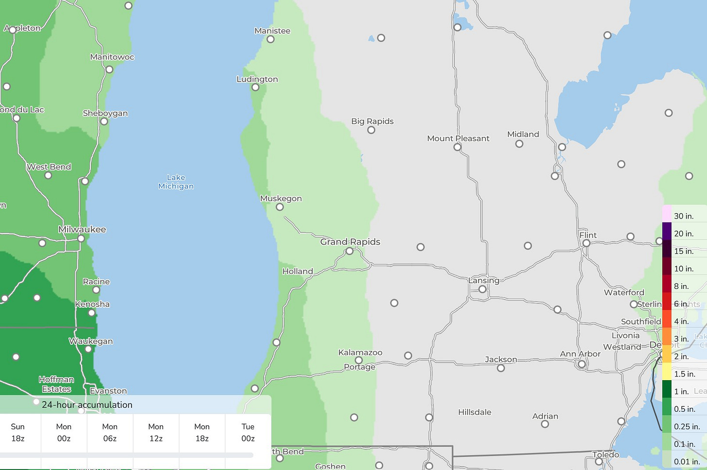 Rainfall was meager on Friday, with 0.12” of rain officially in Grand Rapids. Just a trace of rain fell in Muskegon, Kalamazoo and Battle Creek. Jackson had 0.30” of rain and they had a 52 mph wind gust.