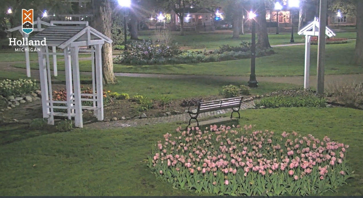 This is a webcam grab of Centennial Park in Holland around 2:30 am this Saturday. LOTS of tulips in bloom now, literally over a million blooming in Holland right now. The blossoms are out on the ornamental pear trees downtown and we’re counting down the days until Tulip Time. There are two big parades now at Tulip Time…the Children’s Parade on Thursday and the Music Parade on Saturday (2 pm).
