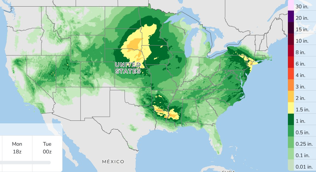 Here’s 3-day rainfall (Sat. - Mon.). Some significant rain in the Midwest, Lower Mississippi Valley and along the Mid-Atlantic. A period of rain is possible in San Diego and across Nevada, which is the driest state in the U.S.