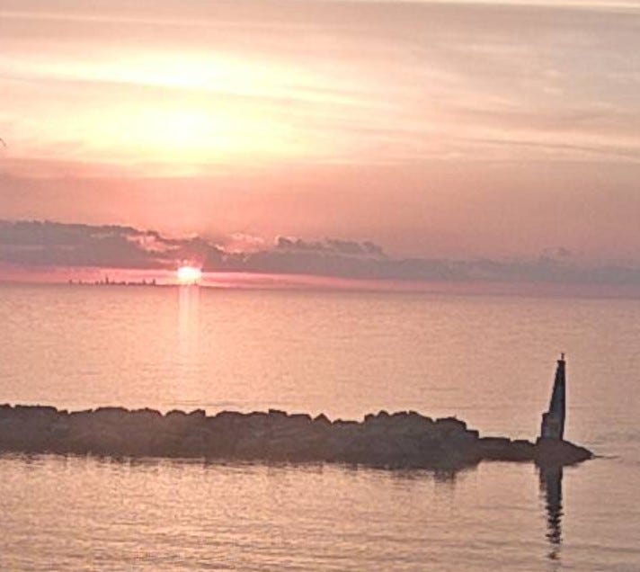 Here’s a cool pic. The sun is setting at Michigan City, Indiana. You can see the skyline of the city of Chicago to the left of the sun. Those skyscrapers are 40 miles away.