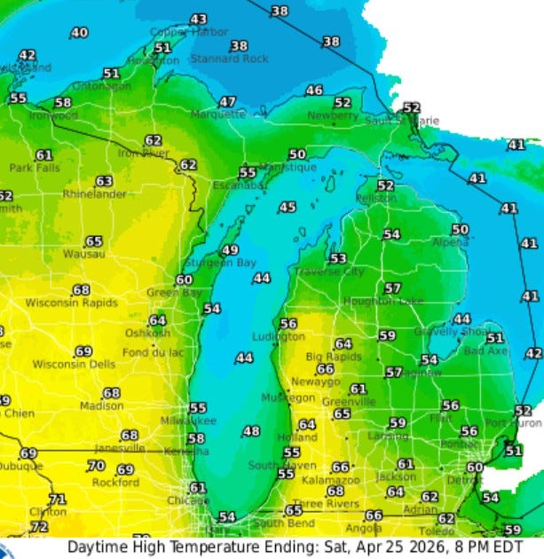 This should be a nice weekend. We’ll become partly to mostly sunny today and stay mostly sunny on Sunday. Here’s a map showing forecast high temperatures today with mid 60s inland and mid 50s along the lakeshore where the north wind will be coming over the cool water of Lake Michigan. So, the shore at S. Haven and Benton Harbor will be about 10 degrees cooler than inland areas like Grand Rapids and Kalamazoo.