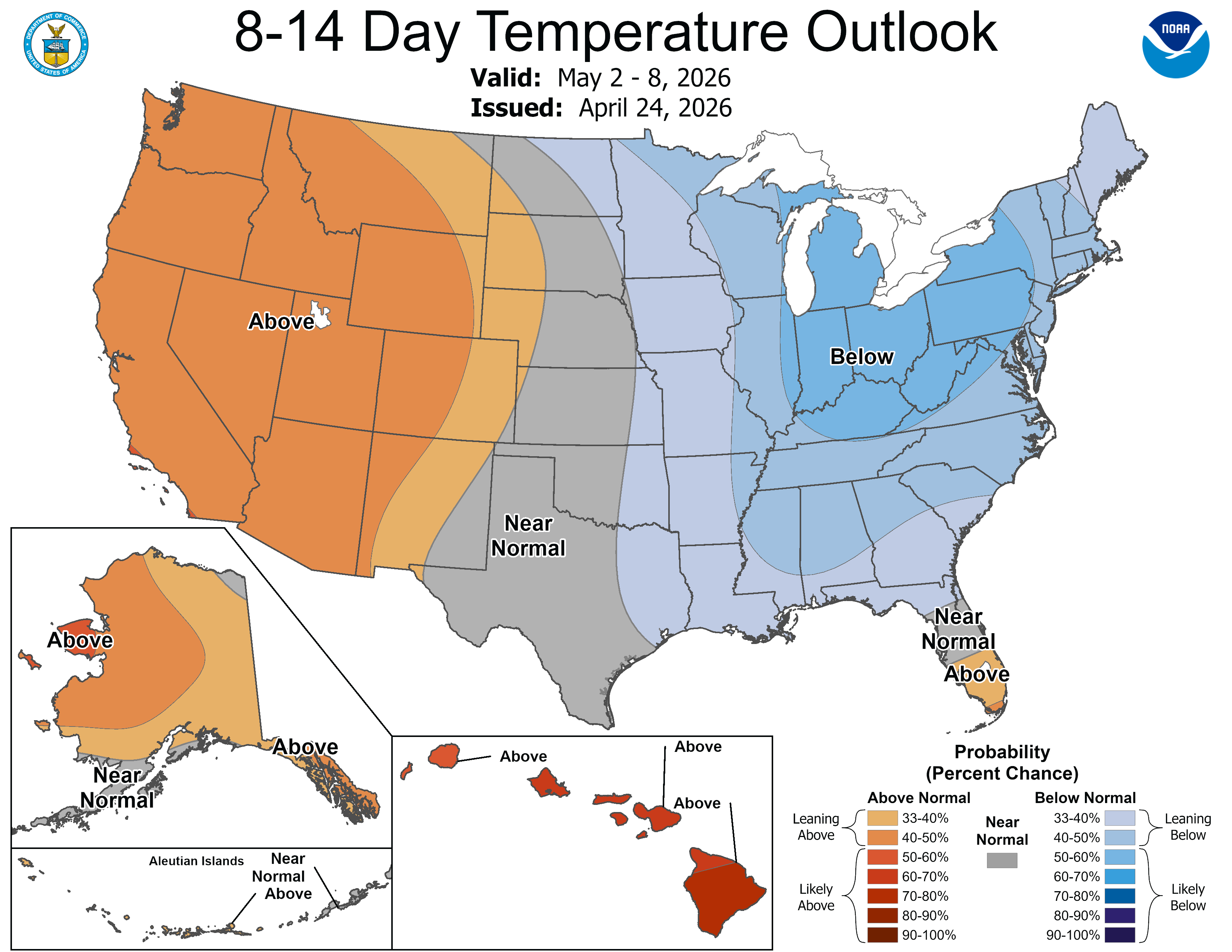 The latest 8-14 day temperature outlook continues to forecast cooler than average temperatures over the Great Lakes and Northeast. Keep in mind that this is a 7-day average…it may be cooler than average at the beginning of the period, but starting to trend to warm toward the end of the 7 days. Nevertheless, I’d continue to hold off planting anything frost sensitive.