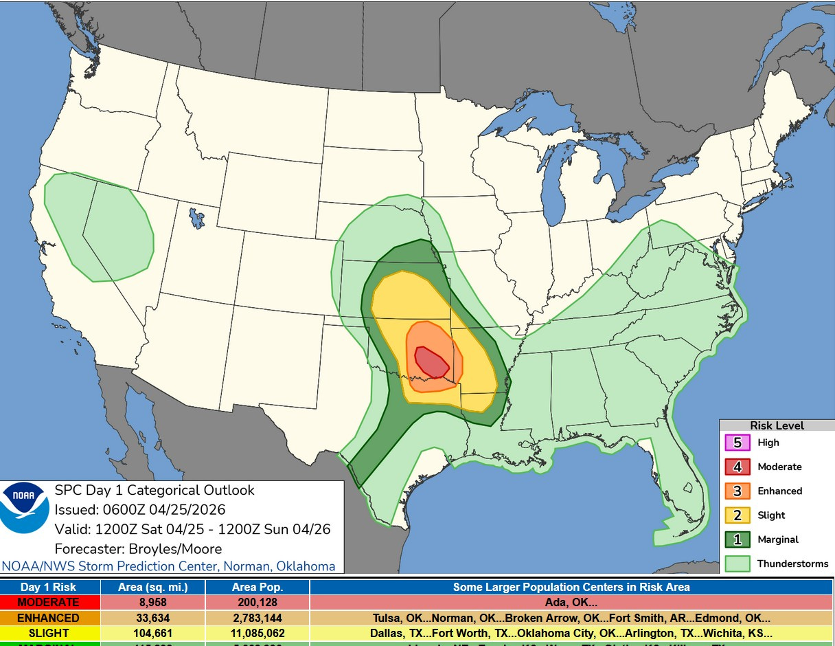 Here’s the Severe Weather Outlook Map for today (Saturday). There is a level 4 (moderate risk, red color on the map) for SE Oklahoma. No thunderstorms in Michigan this week.