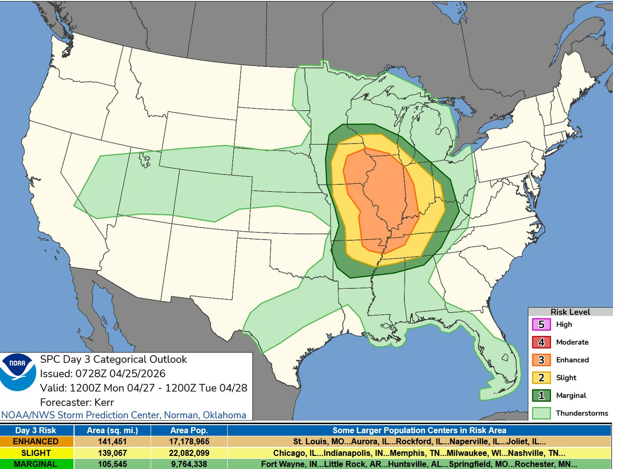 This is the Severe Weather Outlook Map for Monday. It looks like another big day of severe weather, with a large level 3 Enhance Risk area centered on Illinois. Again, tornadoes are possible, scattered wind damage is likely. Storms should be weakening as they cross Lake Michigan well after sunset.