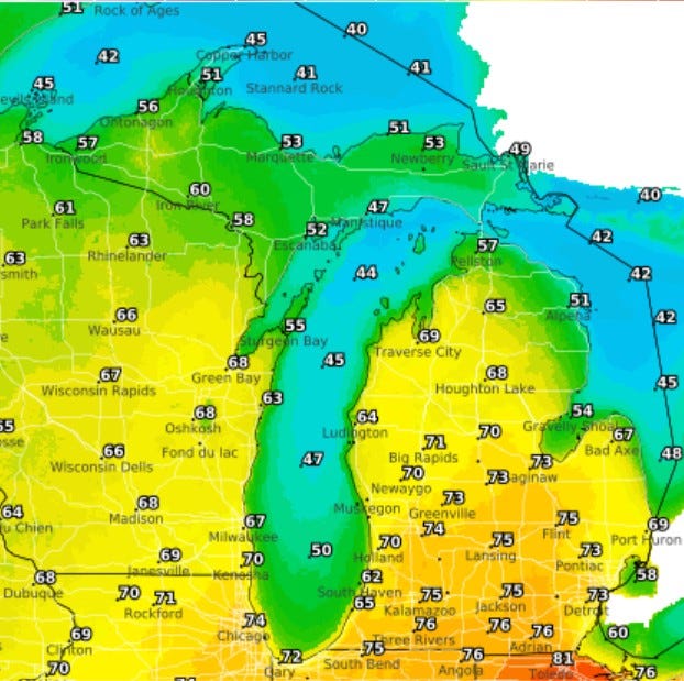 Here’s high temperatures from Thursday. Look at the top temperature and the bottom temperature. Traverse City reached a warm 81, while not all that far away, Mackinac Island had a high temperature of just 45. Traverse City had a warm, south wind off the land, while Mackinac Island had a damp, brisk east wind off Lake Huron.
