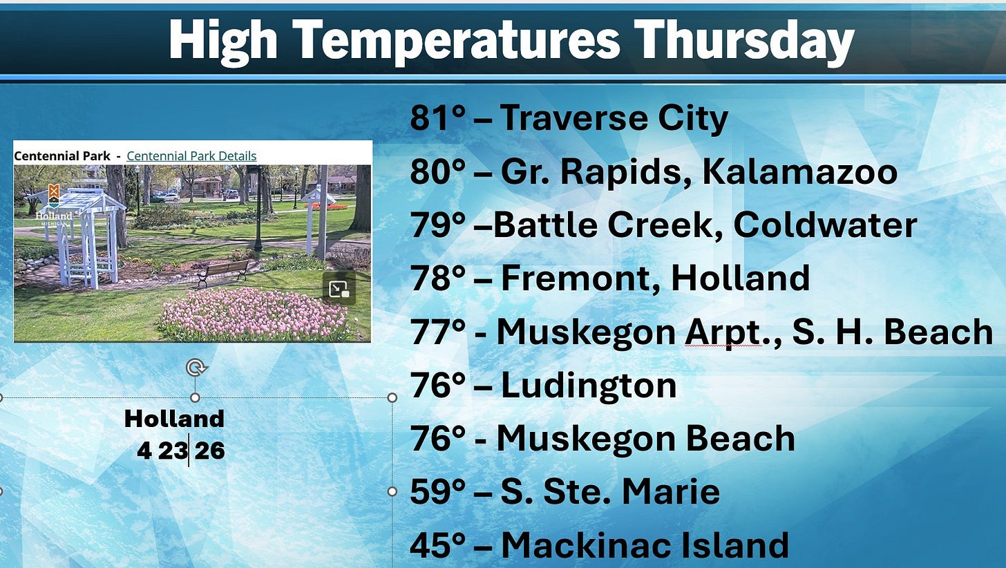 It was the first 80 degree temperature of the year for Grand Rapids, and probably the warmest day we’ll see for maybe a couple of weeks. Nice pic. here courtesy of the city of Holland. Overall, the weather should be cool and pleasant for Tulip Time.