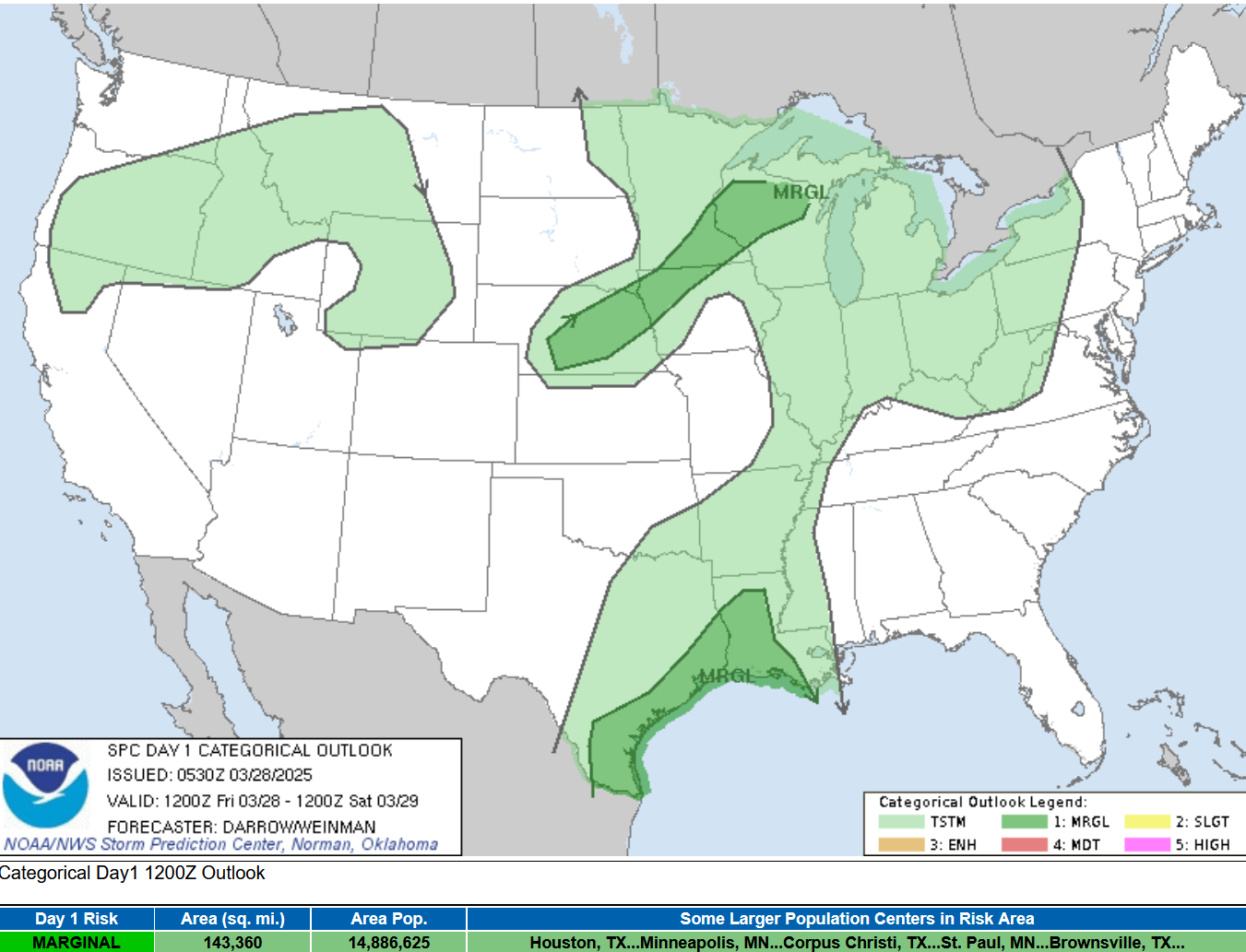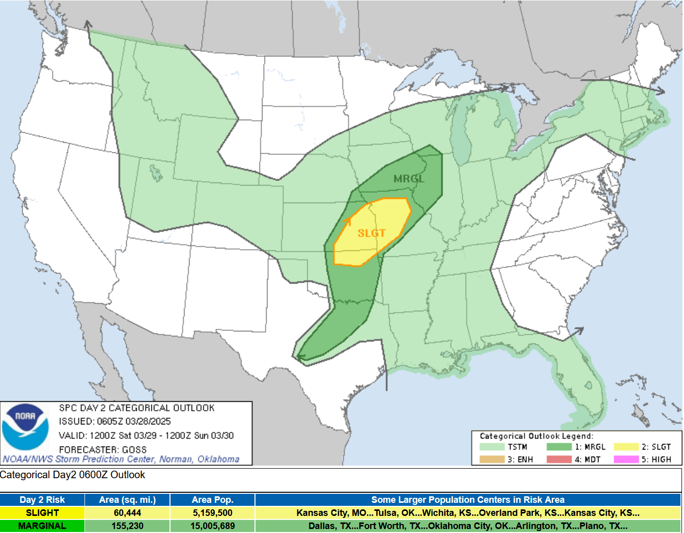 Severe Weather is also likely in the Midwest on Saturday, March 29. The Severe Weather Outlook for Saturday shows a Slight Risk (level 2) over southeast Kansas, northeast Oklahoma and western Missouri. Once again, there is a chance of a non-severe thunderstorm in Michigan.