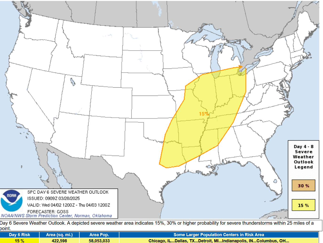 Regarding the severe threat next Wednesday (April 2), SPC says: “confidence is high enough to proceed with introduction of a broad -- though areally uncertain -- 15% area. This system would appear to have the potential to produce another fairly widespread/all-hazards severe event, but will likely require a good bit of adjustment over the next few days.”