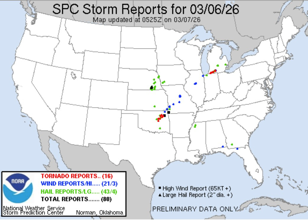 Here’s a map of severe weather reports for Friday. There were 16 reported tornadoes. This number will be reduced when storm surveys confirm that there were multiple sightings of the same tornado (like in Union City). In the U.S. there were 21 reports of wind damage and 43 reports of severe hail )including several in the Lansing area.