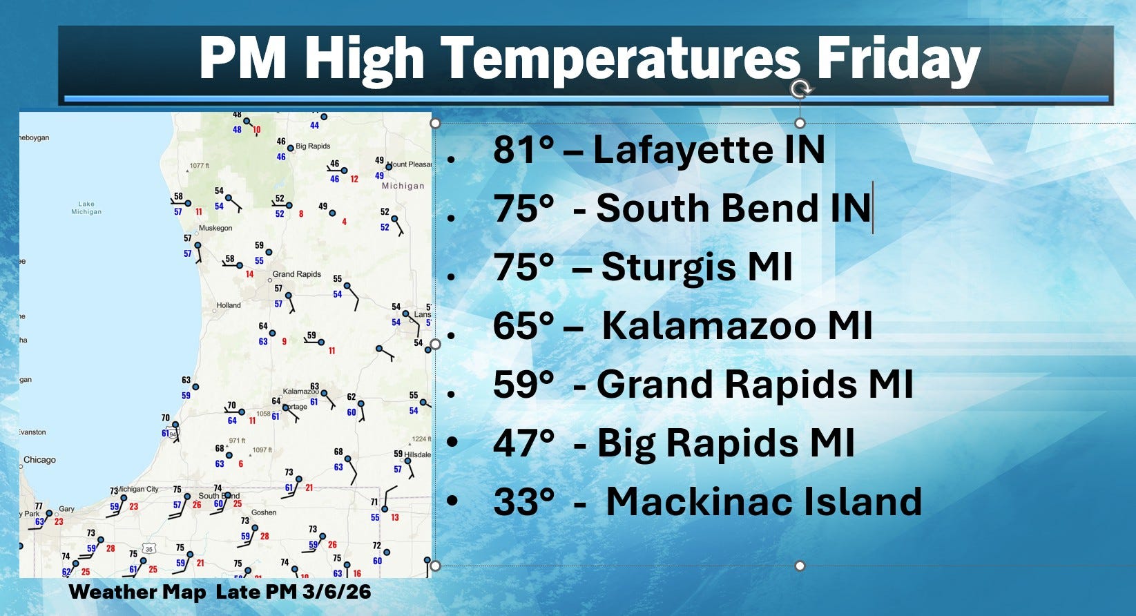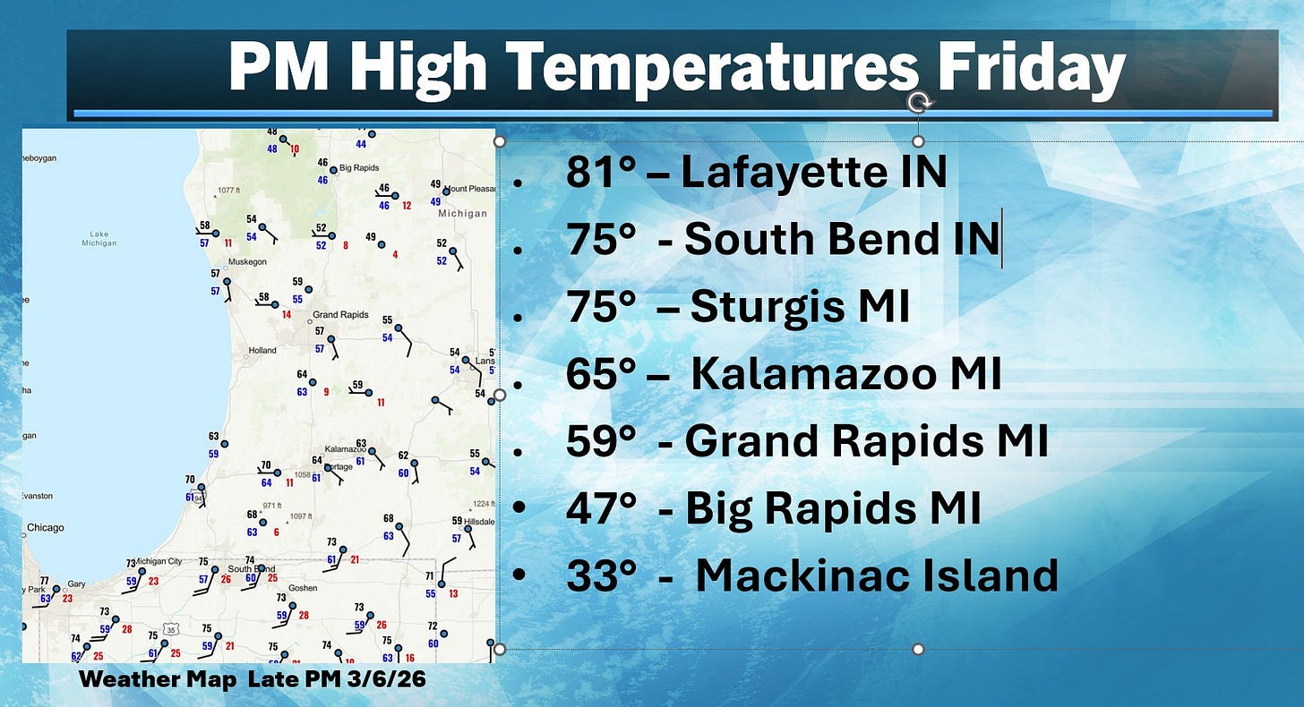 A strong warm front was moving north through southwest Lower Michigan. These are high temperatures through 7 pm Friday. It’s still astronomical winter and temperatures were in the mid 70s to low 80’s in Indiana and far southern Lower Michigan. Dewpoints rose to near 60. This warm, moist air was pushing north into relatively cool air (mid 40s at Big Rapids).