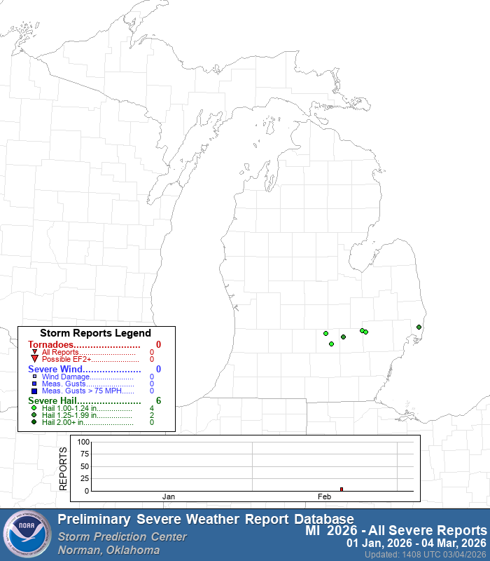 Here’s the severe weather reports in Michigan so far this year…all marginal hail reports (1 to 1 1/4” in diameter). The six reports all occurred on Feb. 18.