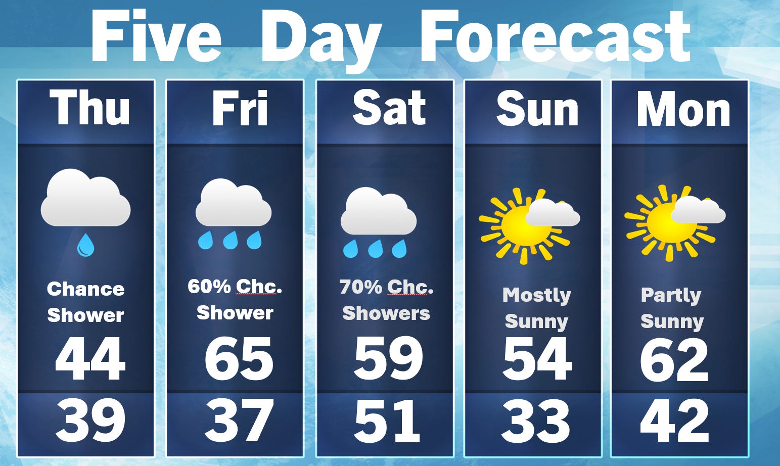 Our average temperature is 40, so this is an unseasonably warm week. While I have shower symbols on the graphic above, a thunderstorm is also possible…best bet for us probably Friday night.