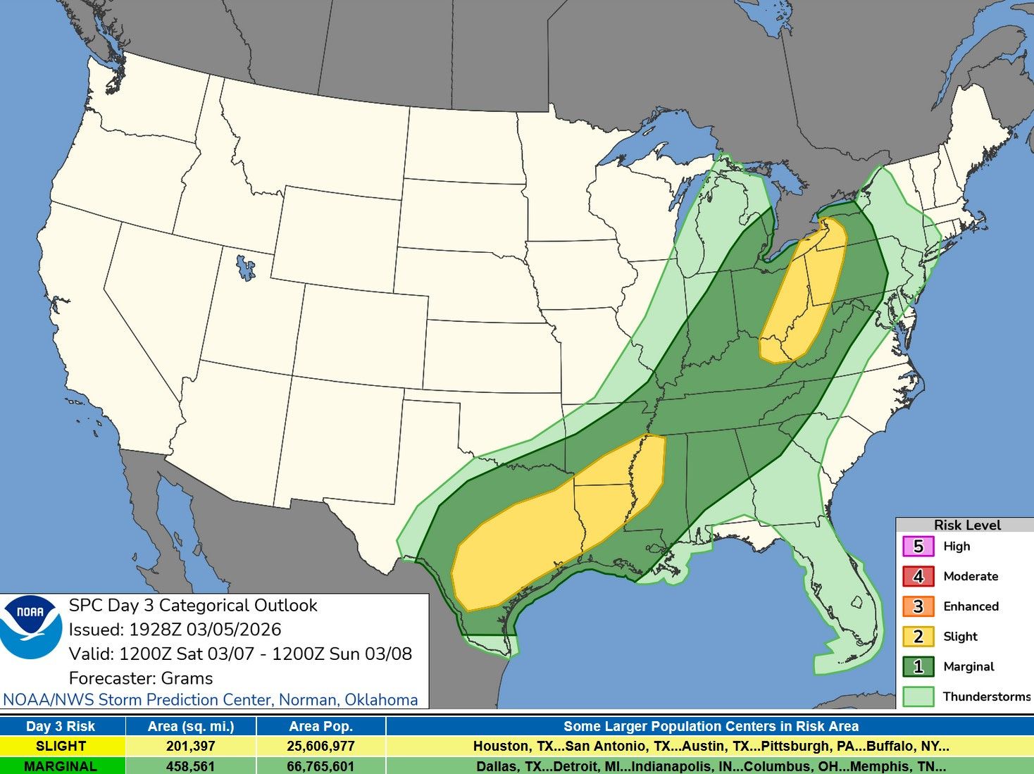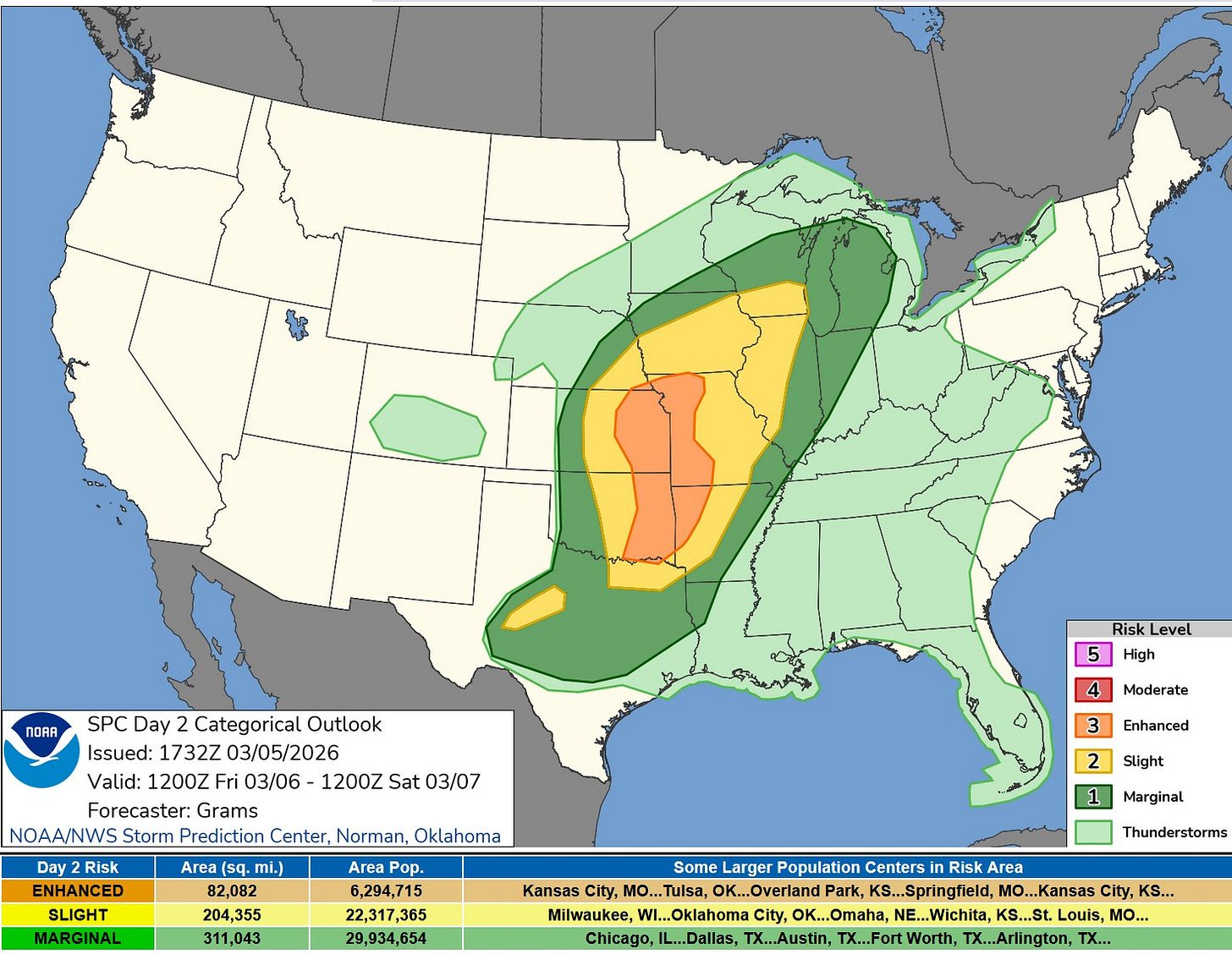Here’s the severe weather outlook area from the Storm Prediction Center for this Friday/Friday night. There is an Enhance Risk (level 3) from Eastern Oklahoma and northwest Arkansas north to the IA/MO border. The Enhanced Risk (in orange on the map above) is surrounded by a Slight Risk (level 2) from NE Texas to Lake Michigan. SPC says: “One elongated QLCS (Quasi-Linear Convective System) or a pair of QLCSs may evolve during the evening. The lead one should progress east-northeast towards the Lake MI vicinity with a threat for mainly damaging winds and a few embedded tornadoes.”