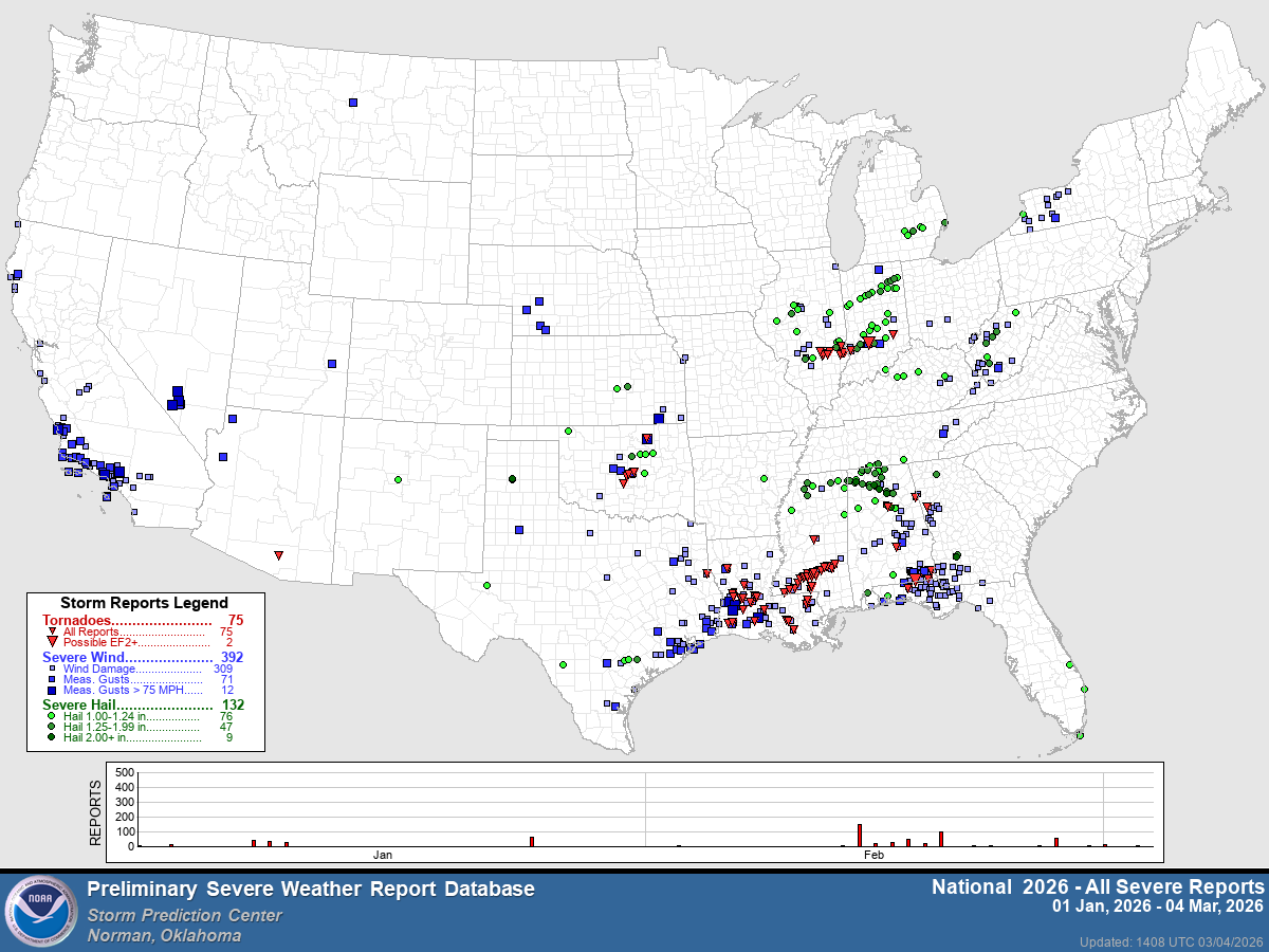 So far this year (through March 4), the U.S. has had 75 tornadoes. The average-to-date is 119 tornadoes. One of the reasons for the low tornado count is the cold pattern we have had for much of the winter in the eastern half of the US. Another interesting note is that the tornadoes we have had have generally been week. Seventy-three of the 75 tornadoes were rated EF0 or EF1.
